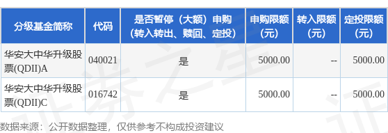 证券之星消息,12月29日华安基金管理有限公司发布《关于华安大中华升级股票型证券投资基金暂停大额申购及大额定期定额投资的公告》。公告中提示,为了保证基金的平稳运作,保护基金持有人利益,本基金管理人决定自2025年12月31日起暂停本基金的大额申购及大额定期定额投资业务,自2025年12月31日起华安大中华升级股票型证券投资基金暂停大额申购及大额定期定额投资,申购上限金额为0.5万元,下属分级基金调整明细如下: