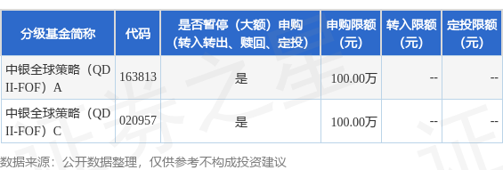 证券之星消息,1月5日中银基金管理有限公司发布《关于中银全球策略证券投资基金(FOF)暂停大额申购及定期定额投资业务的公告》。公告中提示,为保护基金份额持有人利益,自2026年1月5日起中银全球策略证券投资基金(FOF)暂停大额申购及定期定额投资业务,下属分级基金调整明细如下: