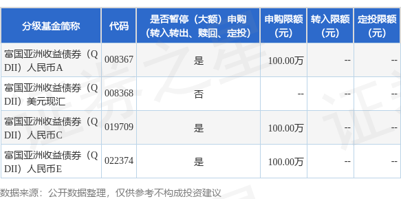 证券之星消息,1月7日富国基金管理有限公司发布《关于富国亚洲收益债券型证券投资基金(QDII)(A、C、E类份额)暂停个人投资者大额申购及定期定额投资业务的公告》。公告中提示,为了保证基金的平稳运作,保护基金持有人的利益,自2026年1月8日起富国亚洲收益债券型证券投资基金(QDII)(A、C、E类份额)暂停个人投资者大额申购及定期定额投资业务,下属分级基金调整明细如下: