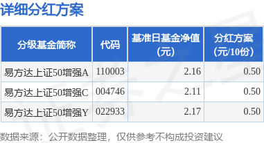 证券之星消息,1月8日发布《易方达上证50指数增强型证券投资基金分红公告》。本次分红为2025年度的第1次分红。公告显示,本次分红的收益分配基准日为12月12日,详细分红方案如下: