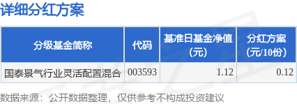 证券之星消息,1月10日发布《国泰景气行业灵活配置混合型证券投资基金分红公告》。本次分红为2026年度第一次分红。。公告显示,本次分红的收益分配基准日为12月12日,详细分红方案如下: