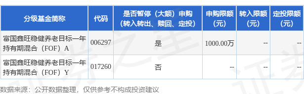 证券之星消息,1月10日富国基金管理有限公司发布《关于富国鑫旺稳健养老目标一年持有期混合型基金中基金(FOF)(A类份额)暂停大额申购及定期定额投资业务的公告》。公告中提示,为了保证基金的平稳运作,保护基金持有人的利益,自2026年1月12日起富国鑫旺稳健养老目标一年持有期混合型基金中基金(FOF)(A类份额)暂停大额申购及定期定额投资业务,下属分级基金调整明细如下: