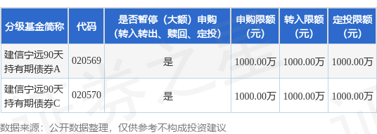 证券之星消息,1月12日建信基金管理有限责任公司发布《建信宁远90天持有期债券型证券投资基金基金暂停大额申购、大额转换转入、定期定额投资公告》。公告中提示,为保护基金份额持有人利益,自2026年1月13日起建信宁远90天持有期债券型证券投资基金基金暂停大额申购、大额转换转入、定期定额投资,申购、转换转入上限金额为1000.0万元,下属分级基金调整明细如下: