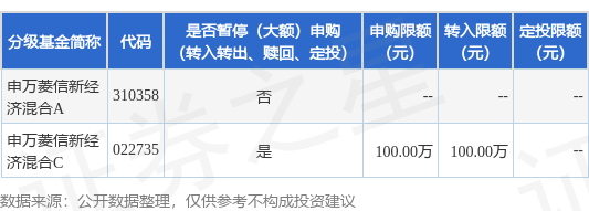 证券之星消息,1月13日申万菱信基金管理有限公司发布《关于申万菱信新经济混合型证券投资基金C类基金份额暂停大额申购、转换转入、定期定额投资的公告》。公告中提示,为保证基金的平稳运作,保护基金份额持有人的利益,自2026年1月13日起申万菱信新经济混合型证券投资基金C类基金份额暂停大额申购、转换转入、定期定额投资,下属分级基金调整明细如下: