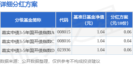 证券之星消息,1月14日发布《嘉实中债3-5年国开行债券指数证券投资基金2025年第四次收益分配公告》。本次分红为2025年的第四次分红。公告显示,本次分红的收益分配基准日为12月12日,详细分红方案如下: