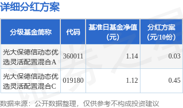 证券之星消息,1月14日发布《光大保德信动态优选灵活配置混合型证券投资基金分红公告》。本次分红为2026年度第1次分红。公告显示,本次分红的收益分配基准日为12月12日,详细分红方案如下: