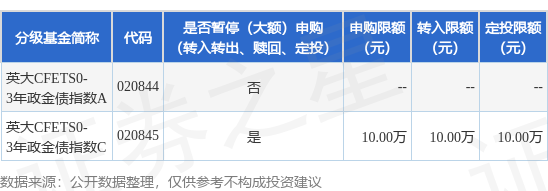 证券之星消息,1月16日英大基金管理有限公司发布《关于英大CFETS0-3年期政策性金融债指数证券投资基金C类基金份额暂停大额申购、大额转换转入、大额定期定额投资业务的公告》。公告中提示,为保护基金份额持有人利益,自2026年1月16日起英大CFETS0-3年期政策性金融债指数证券投资基金C类基金份额暂停大额申购、大额转换转入、大额定期定额投资业务,下属分级基金调整明细如下: