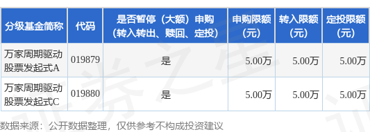 证券之星消息,1月19日万家基金管理有限公司发布《万家周期驱动股票型发起式证券投资基金基金暂停(大额)申购(转换转入、赎回、转换转出、定期定额投资)公告》。公告中提示,为了保证基金的平稳运作,保护基金份额持有人的利益,自2026年1月20日起万家周期驱动股票型发起式证券投资基金基金暂停(大额)申购(转换转入、赎回、转换转出、定期定额投资),申购、转换转入上限金额为5.0万元,下属分级基金调整明细如下: