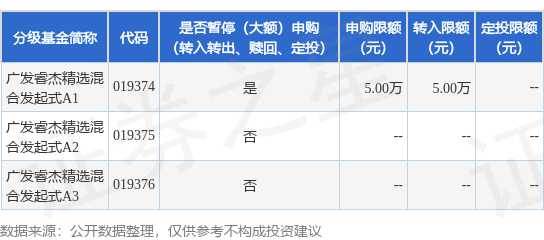 证券之星消息,1月19日广发基金管理有限公司发布《关于广发睿杰精选混合型发起式证券投资基金A1类基金份额暂停大额申购(含转换转入、定期定额和不定额投资)业务的公告》。公告中提示,为保护基金份额持有人利益,自2026年1月20日起广发睿杰精选混合型发起式证券投资基金A1类基金份额暂停大额申购(含转换转入、定期定额和不定额投资)业务,下属分级基金调整明细如下: