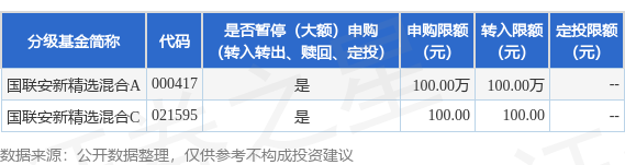 注:1、自2026年1月19日起,国联安新精选混合A类基金份额单个账户单日累计申购、转换转入及定期定额投资金额应小于等于一百万元,国联安新精选混合C类基金份额单个账户单日累计申购、转换转入及定期定额投资金额应小于等于一百元,如单个基金账户单日累计申购、转换转入及定期定额投资金额大于上述限额的,本基金管理人将本着保护基金份额持有人合法权益的原则决定是否拒绝。敬请投资者及早做好交易安排,避免因大额申购、转换转入及定期定额投资限额的调整带来不便及资金的损失;