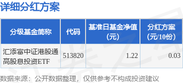 证券之星消息,1月22日发布《汇添富中证港股通高股息投资交易型开放式指数证券投资基金收益分配公告》。本次分红为本基金2026年度第1次分红。公告显示,本次分红的收益分配基准日为1月1日,详细分红方案如下: