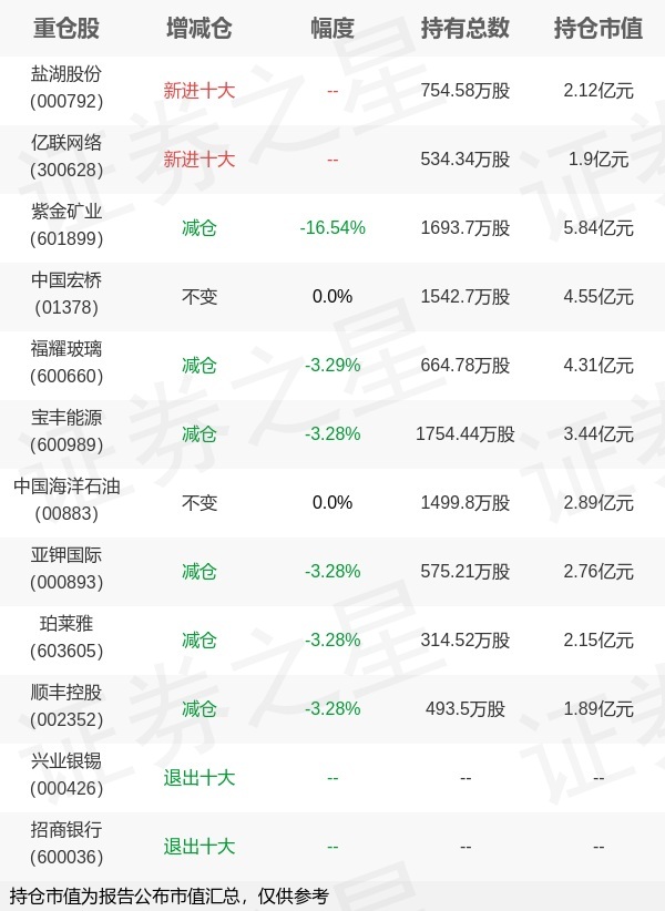 证券之星消息,1月22日东方红资产管理旗下张伟锋管理的东方红睿玺三年持有期混合型基金公布年报,近1年净值增长率26.68%。与上一季度相比,该基金前十大重仓股新增盐湖股份,亿联网络;其中紫金矿业持仓占比10.36%,为该基金第一大重仓股;兴业银锡,招商银行等退出前十大重仓股;详细数据如下: