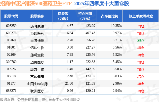 从基金规模来看,招商中证沪港深500医药卫生ETF基金2025年四季度公布的基金规模为0.41亿元,较上一期规模4453.84万元变化了-365.63万元,环比变化了-8.21%。该基金最新一期资产配置为:股票占净值比99.06%,无债券类资产,现金占净值比0.96%。从基金持仓来看,该基金当季前十大股票仓位达58.01%,第一大重仓股为药明康德(603259),持仓占比为10.35%。
