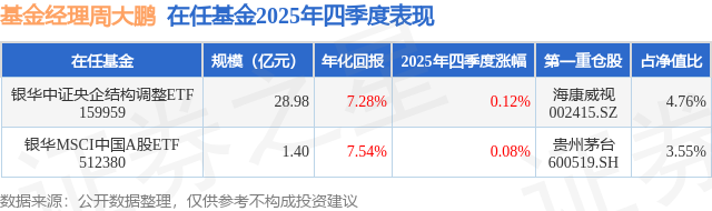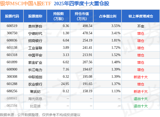 从基金规模来看,银华MSCI中国A股ETF基金2025年四季度公布的基金规模为1.4亿元,较上一期规模1.35亿元变化了490.21万元,环比变化了3.62%。该基金最新一期资产配置为:股票占净值比96.65%,无债券类资产,现金占净值比3.39%。从基金持仓来看,该基金当季前十大股票仓位达18.77%,第一大重仓股为贵州茅台(600519),持仓占比为3.55%。