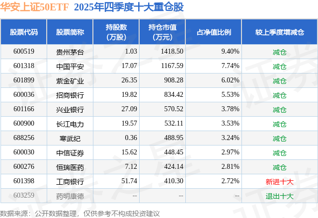 从基金规模来看,华安上证50ETF基金2025年四季度公布的基金规模为1.51亿元,较上一期规模1.63亿元变化了-1214.65万元,环比变化了-7.45%。该基金最新一期资产配置为:股票占净值比99.09%,无债券类资产,现金占净值比1.16%。从基金持仓来看,该基金当季前十大股票仓位达47.74%,第一大重仓股为贵州茅台(600519),持仓占比为9.4%。