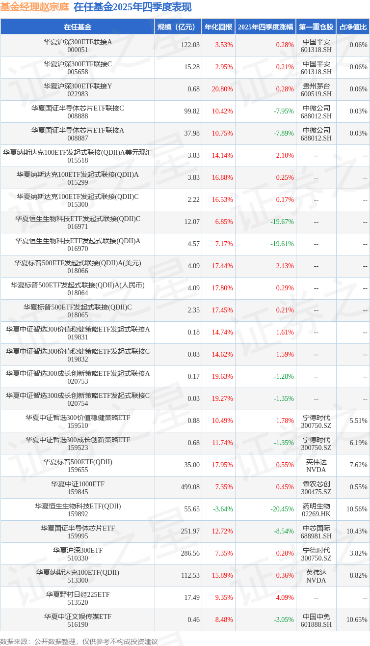 华夏沪深300ETF现任基金经理为赵宗庭。其中在任基金经理赵宗庭已从业8年又282天,2017年4月17日正式接手管理华夏沪深300ETF,任职期间累计回报为60.58%。目前还管理着27只基金产品(包括A类和C类),其中本季度表现最佳的基金为华夏野村日经225ETF(513520),季度净值涨幅为4.09%。