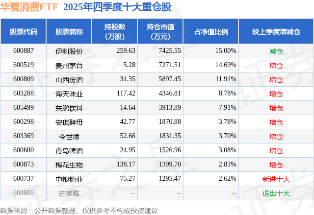从基金规模来看,华夏消费ETF基金2025年四季度公布的基金规模为4.95亿元,较上一期规模4.99亿元变化了-424.91万元,环比变化了-0.85%。该基金最新一期资产配置为:股票占净值比99.93%,无债券类资产,现金占净值比0.31%。从基金持仓来看,该基金当季前十大股票仓位达74.3%,第一大重仓股为伊利股份(600887),持仓占比为15.0%。