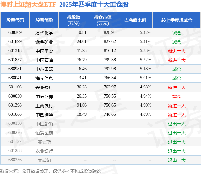 从基金规模来看,博时上证超大盘ETF基金2025年四季度公布的基金规模为1.53亿元,较上一期规模1.57亿元变化了-355.78万元,环比变化了-2.27%。该基金最新一期资产配置为:股票占净值比99.28%,无债券类资产,现金占净值比0.86%。从基金持仓来看,该基金当季前十大股票仓位达51.28%,第一大重仓股为万华化学(600309),持仓占比为5.42%。