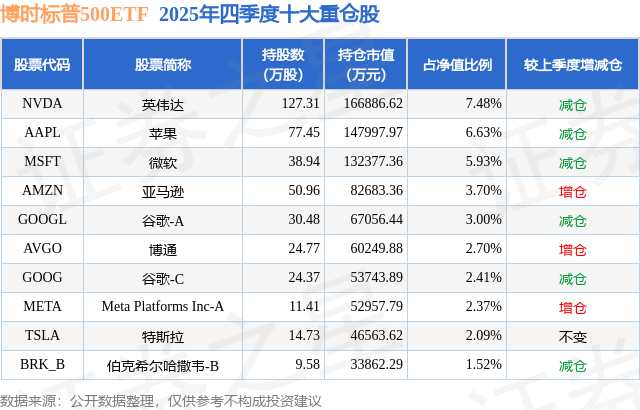 从基金规模来看,博时标普500ETF基金2025年四季度公布的基金规模为223.2亿元,较上一期规模220.38亿元变化了2.82亿元,环比变化了1.28%。该基金最新一期资产配置为:股票占净值比94.1%,无债券类资产,现金占净值比4.04%。从基金持仓来看,该基金当季前十大股票仓位达37.83%,第一大重仓股为英伟达(NVDA),持仓占比为7.48%。