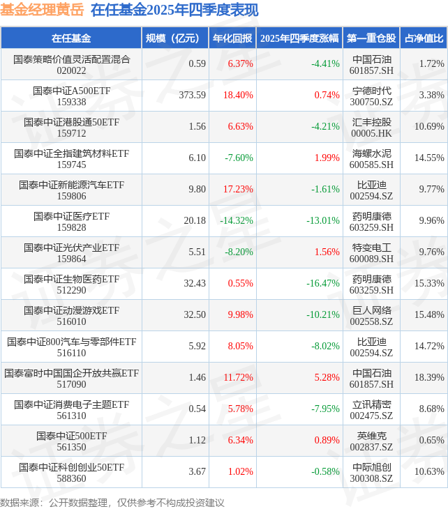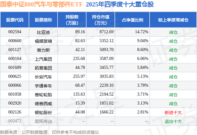 从基金规模来看,国泰中证800汽车与零部件ETF基金2025年四季度公布的基金规模为5.92亿元,较上一期规模8.96亿元变化了-3.04亿元,环比变化了-33.91%。该基金最新一期资产配置为:股票占净值比99.55%,无债券类资产,现金占净值比0.65%。从基金持仓来看,该基金当季前十大股票仓位达62.82%,第一大重仓股为比亚迪(002594),持仓占比为14.72%。