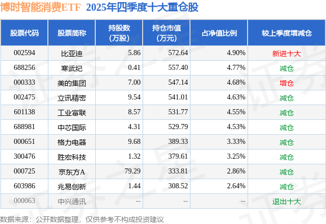 从基金规模来看,博时智能消费ETF基金2025年四季度公布的基金规模为1.17亿元,较上一期规模1.42亿元变化了-2557.0万元,环比变化了-17.95%。该基金最新一期资产配置为:股票占净值比98.58%,无债券类资产,现金占净值比1.46%。从基金持仓来看,该基金当季前十大股票仓位达40.14%,第一大重仓股为比亚迪(002594),持仓占比为4.9%。