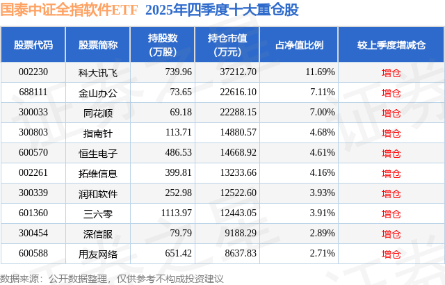 从基金规模来看,国泰中证全指软件ETF基金2025年四季度公布的基金规模为31.83亿元,较上一期规模19.15亿元变化了12.67亿元,环比变化了66.17%。该基金最新一期资产配置为:股票占净值比99.66%,无债券类资产,现金占净值比0.46%。从基金持仓来看,该基金当季前十大股票仓位达52.69%,第一大重仓股为科大讯飞(002230),持仓占比为11.69%。