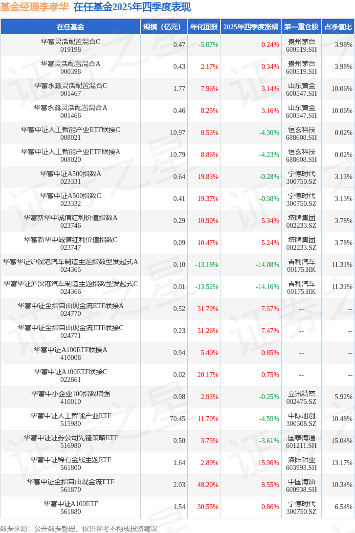 从基金规模来看,华富中证稀有金属主题ETF基金2025年四季度公布的基金规模为1.64亿元,较上一期规模1.93亿元变化了-2921.86万元,环比变化了-15.14%。该基金最新一期资产配置为:股票占净值比99.48%,无债券类资产,现金占净值比0.75%。从基金持仓来看,该基金当季前十大股票仓位达59.11%,第一大重仓股为洛阳钼业(603993),持仓占比为13.17%。