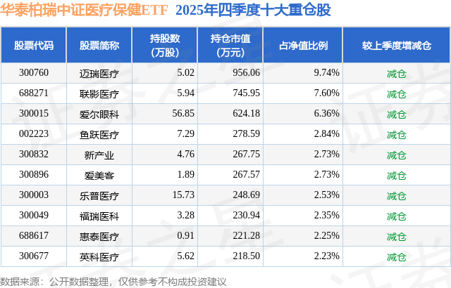 从基金规模来看,华泰柏瑞中证医疗保健ETF基金2025年四季度公布的基金规模为0.98亿元,较上一期规模1.46亿元变化了-4775.92万元,环比变化了-32.73%。该基金最新一期资产配置为:股票占净值比98.68%,无债券类资产,现金占净值比1.53%。从基金持仓来看,该基金当季前十大股票仓位达41.36%,第一大重仓股为迈瑞医疗(300760),持仓占比为9.74%。