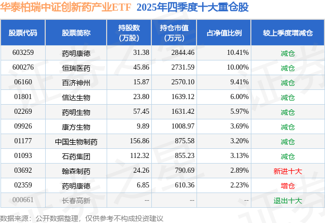 从基金规模来看,华泰柏瑞中证创新药产业ETF基金2025年四季度公布的基金规模为2.73亿元,较上一期规模3.49亿元变化了-7608.22万元,环比变化了-21.78%。该基金最新一期资产配置为:股票占净值比96.95%,无债券类资产,现金占净值比3.11%。从基金持仓来看,该基金当季前十大股票仓位达56.93%,第一大重仓股为药明康德(603259),持仓占比为10.41%。