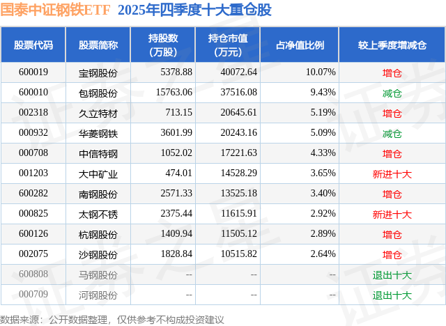 从基金规模来看,国泰中证钢铁ETF基金2025年四季度公布的基金规模为39.8亿元,较上一期规模36.6亿元变化了3.21亿元,环比变化了8.76%。该基金最新一期资产配置为:股票占净值比99.72%,无债券类资产,现金占净值比0.69%。从基金持仓来看,该基金当季前十大股票仓位达49.61%,第一大重仓股为宝钢股份(600019),持仓占比为10.07%。