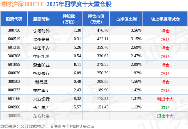 从基金规模来看,博时沪深300ETF基金2025年四季度公布的基金规模为1.34亿元,较上一期规模1.24亿元变化了978.95万元,环比变化了7.89%。该基金最新一期资产配置为:股票占净值比92.51%,无债券类资产,现金占净值比7.32%。从基金持仓来看,该基金当季前十大股票仓位达21.3%,第一大重仓股为宁德时代(300750),持仓占比为3.56%。
