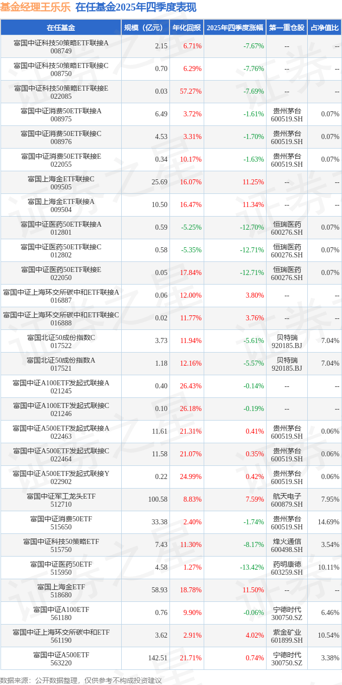 从基金规模来看,富国中证消费50ETF基金2025年四季度公布的基金规模为33.38亿元,较上一期规模31.28亿元变化了2.1亿元,环比变化了6.72%。该基金最新一期资产配置为:股票占净值比99.6%,无债券类资产,现金占净值比0.6%。从基金持仓来看,该基金当季前十大股票仓位达74.76%,第一大重仓股为贵州茅台(600519),持仓占比为14.69%。