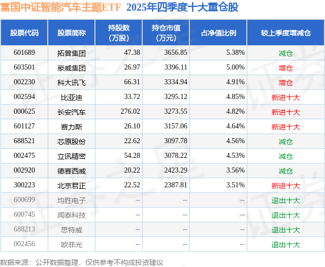 从基金规模来看,富国中证智能汽车主题ETF基金2025年四季度公布的基金规模为6.8亿元,较上一期规模7.72亿元变化了-9194.91万元,环比变化了-11.92%。该基金最新一期资产配置为:股票占净值比99.66%,无债券类资产,现金占净值比1.13%。从基金持仓来看,该基金当季前十大股票仓位达45.76%,第一大重仓股为拓普集团(601689),持仓占比为5.38%。