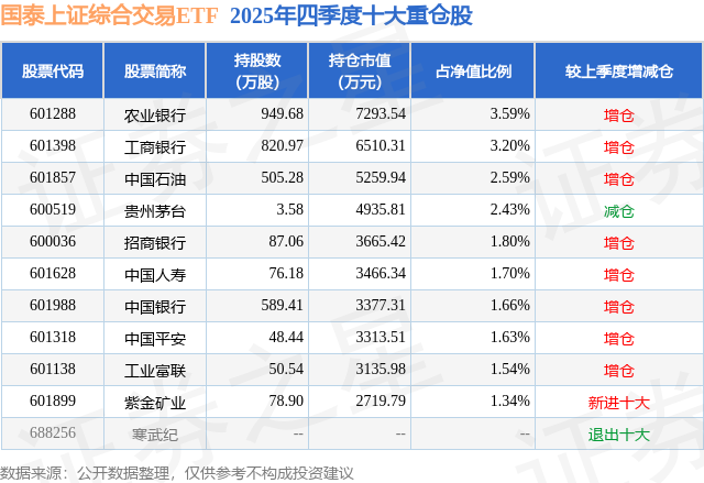 从基金规模来看,国泰上证综合交易ETF基金2025年四季度公布的基金规模为20.34亿元,较上一期规模18.97亿元变化了1.37亿元,环比变化了7.22%。该基金最新一期资产配置为:股票占净值比99.8%,无债券类资产,现金占净值比0.22%。从基金持仓来看,该基金当季前十大股票仓位达21.48%,第一大重仓股为农业银行(601288),持仓占比为3.59%。