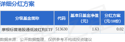 证券之星消息,1月23日发布《摩根标普港股通低波红利交易型开放式指数证券投资基金分红公告》。本次分红为2026年度的第1次分红。公告显示,本次分红的收益分配基准日为1月1日,详细分红方案如下:
