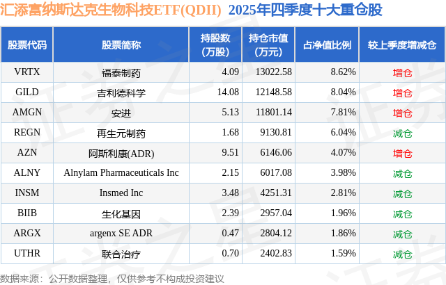 从基金规模来看,汇添富纳斯达克生物科技ETF(QDII)基金2025年四季度公布的基金规模为15.11亿元,较上一期规模13.3亿元变化了1.81亿元,环比变化了13.64%。该基金最新一期资产配置为:股票占净值比88.22%,无债券类资产,现金占净值比0.58%。从基金持仓来看,该基金当季前十大股票仓位达46.78%,第一大重仓股为福泰制药(VRTX),持仓占比为8.62%。