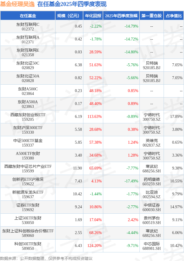 新能源车龙头ETF现任基金经理为吴逸。其中在任基金经理吴逸已从业6年又53天,2022年8月19日正式接手管理新能源车龙头ETF,任职期间累计回报为-4.84%。目前还管理着18只基金产品(包括A类和C类),其中本季度表现最佳的基金为上证50ETF东财(530050),季度净值涨幅为2.42%。