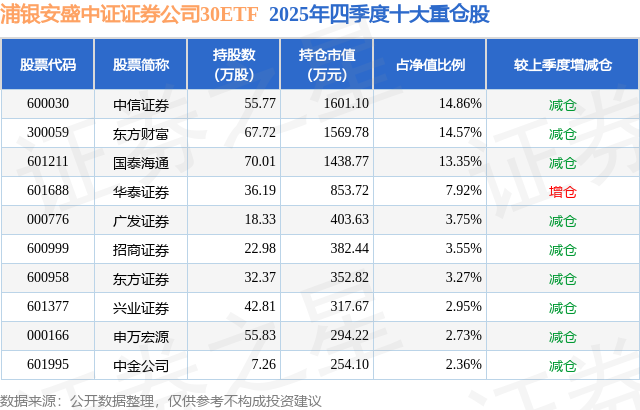 从基金规模来看,浦银安盛中证证券公司30ETF基金2025年四季度公布的基金规模为1.08亿元,较上一期规模1.19亿元变化了-1159.38万元,环比变化了-9.71%。该基金最新一期资产配置为:股票占净值比98.98%,无债券类资产,现金占净值比1.22%。从基金持仓来看,该基金当季前十大股票仓位达69.31%,第一大重仓股为中信证券(600030),持仓占比为14.86%。