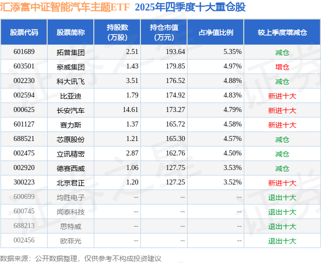 从基金规模来看,汇添富中证智能汽车主题ETF基金2025年四季度公布的基金规模为0.36亿元,较上一期规模4211.41万元变化了-592.67万元,环比变化了-14.07%。该基金最新一期资产配置为:股票占净值比99.15%,无债券类资产,现金占净值比0.95%。从基金持仓来看,该基金当季前十大股票仓位达45.52%,第一大重仓股为拓普集团(601689),持仓占比为5.35%。