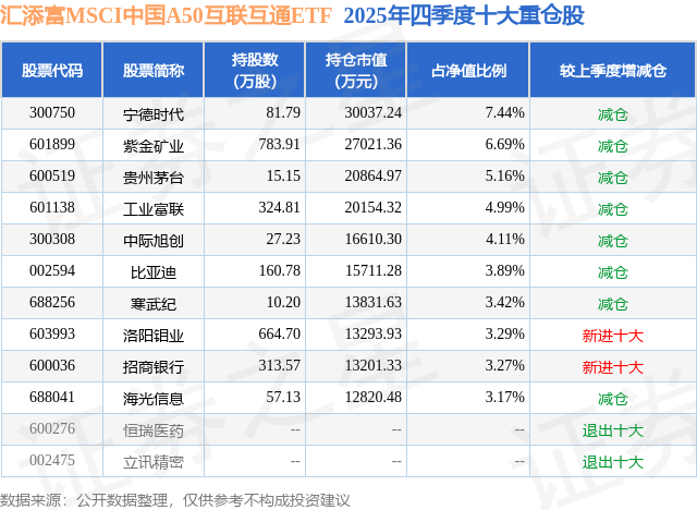 从基金规模来看,汇添富MSCI中国A50互联互通ETF基金2025年四季度公布的基金规模为40.4亿元,较上一期规模44.87亿元变化了-4.47亿元,环比变化了-9.96%。该基金最新一期资产配置为:股票占净值比99.75%,无债券类资产,现金占净值比0.31%。从基金持仓来看,该基金当季前十大股票仓位达45.43%,第一大重仓股为宁德时代(300750),持仓占比为7.44%。