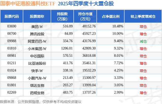 从基金规模来看,国泰中证港股通科技ETF基金2025年四季度公布的基金规模为45.94亿元,较上一期规模46.33亿元变化了-3945.76万元,环比变化了-0.85%。该基金最新一期资产配置为:股票占净值比99.25%,无债券类资产,现金占净值比1.14%。从基金持仓来看,该基金当季前十大股票仓位达68.55%,第一大重仓股为美团-W(03690),持仓占比为10.48%。