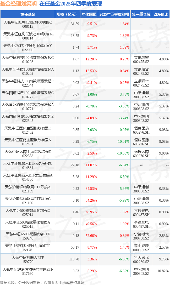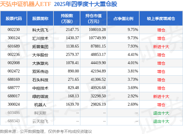 证券之星消息,日前天弘中证机器人ETF基金公布四季报,2025年四季度最新规模110.78亿元,季度净值涨幅为-6.98%。