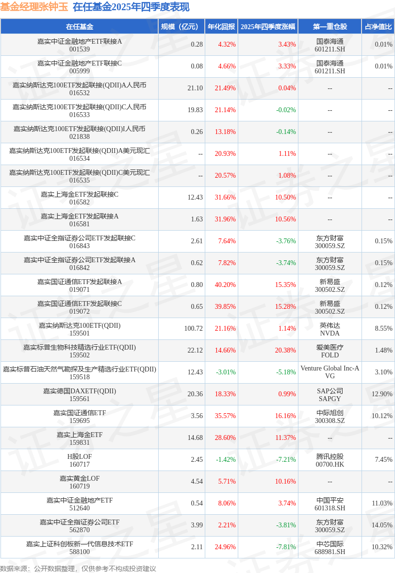 从基金规模来看,嘉实上证科创板新一代信息技术ETF基金2025年四季度公布的基金规模为2.11亿元,较上一期规模3.46亿元变化了-1.35亿元,环比变化了-39.05%。该基金最新一期资产配置为:股票占净值比99.7%,无债券类资产,现金占净值比0.66%。从基金持仓来看,该基金当季前十大股票仓位达55.37%,第一大重仓股为中芯国际(688981),持仓占比为10.32%。