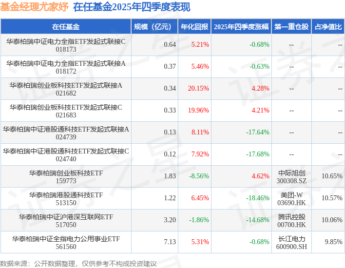 华泰柏瑞中证全指电力公用事业ETF现任基金经理为尤家妤。其中在任基金经理尤家妤已从业0年又211天,2025年6月26日正式接手管理华泰柏瑞中证全指电力公用事业ETF,任职期间累计回报为7.08%。目前还管理着10只基金产品(包括A类和C类),其中本季度表现最佳的基金为华泰柏瑞创业板科技ETF(159773),季度净值涨幅为4.62%。