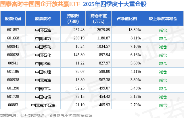 从基金规模来看,国泰富时中国国企开放共赢ETF基金2025年四季度公布的基金规模为1.46亿元,较上一期规模1.79亿元变化了-3327.83万元,环比变化了-18.59%。该基金最新一期资产配置为:股票占净值比99.26%,无债券类资产,现金占净值比2.25%。从基金持仓来看,该基金当季前十大股票仓位达62.78%,第一大重仓股为中国石油(601857),持仓占比为18.39%。