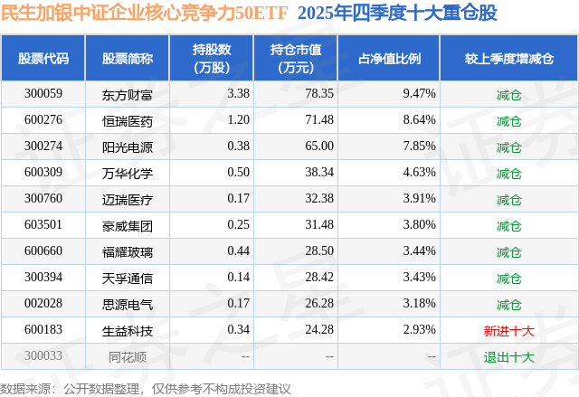 从基金规模来看,民生加银中证企业核心竞争力50ETF基金2025年四季度公布的基金规模为0.08亿元,较上一期规模1020.95万元变化了-193.24万元,环比变化了-18.93%。该基金最新一期资产配置为:股票占净值比97.43%,无债券类资产,现金占净值比3.0%。从基金持仓来看,该基金当季前十大股票仓位达51.28%,第一大重仓股为东方财富(300059),持仓占比为9.47%。