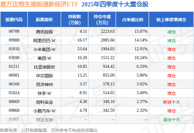 从基金规模来看,易方达恒生港股通新经济ETF基金2025年四季度公布的基金规模为1.48亿元,较上一期规模1.82亿元变化了-3413.38万元,环比变化了-18.79%。该基金最新一期资产配置为:股票占净值比99.84%,无债券类资产,现金占净值比0.31%。从基金持仓来看,该基金当季前十大股票仓位达76.59%,第一大重仓股为腾讯控股(00700),持仓占比为15.07%。