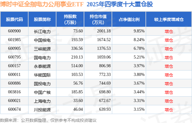 从基金规模来看,博时中证全指电力公用事业ETF基金2025年四季度公布的基金规模为2.03亿元,较上一期规模1.32亿元变化了7069.7万元,环比变化了53.37%。该基金最新一期资产配置为:股票占净值比98.82%,无债券类资产,现金占净值比1.54%。从基金持仓来看,该基金当季前十大股票仓位达51.42%,第一大重仓股为长江电力(600900),持仓占比为9.85%。