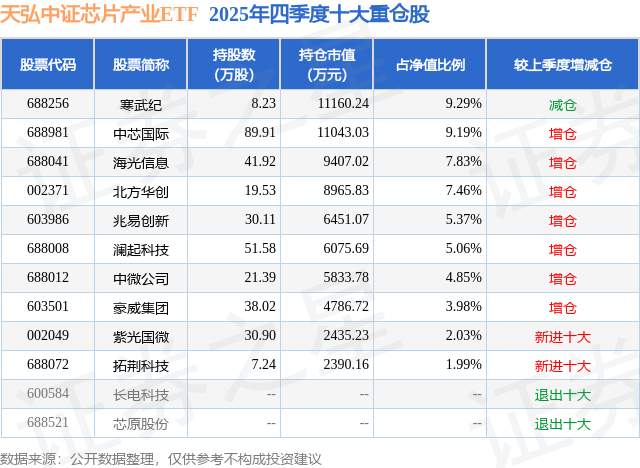 证券之星消息,日前天弘中证芯片产业ETF基金公布四季报,2025年四季度最新规模12.02亿元,季度净值涨幅为-7.58%。