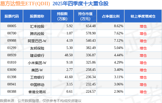 从基金规模来看,易方达恒生ETF(QDII)基金2025年四季度公布的基金规模为0.76亿元,较上一期规模6360.6万元变化了1234.01万元,环比变化了19.4%。该基金最新一期资产配置为:股票占净值比95.48%,无债券类资产,现金占净值比88.85%。从基金持仓来看,该基金当季前十大股票仓位达49.66%,第一大重仓股为汇丰控股(00005),持仓占比为8.62%。